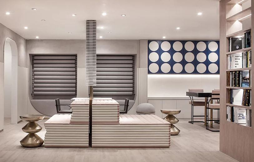 三樓是針對年輕群體的小型工作空間。從大堂乘坐自動扶梯到達(dá)3樓后,首先會有人在展示窗口上用“努力工作”的字眼表示歡迎。x + living利用空間中的健身器材元素來傳達(dá)保持健康和工作之間平衡的想法。設(shè)計融合了有趣的特色,如開放式酒吧區(qū)和前臺側(cè)面的休閑球池。穿過接待區(qū),人們將來到共用會議室和電話亭形的休息室。會議室采用簡約設(shè)計,休息室采用暖色調(diào)裝飾,配有柔軟的座椅和壁墊。