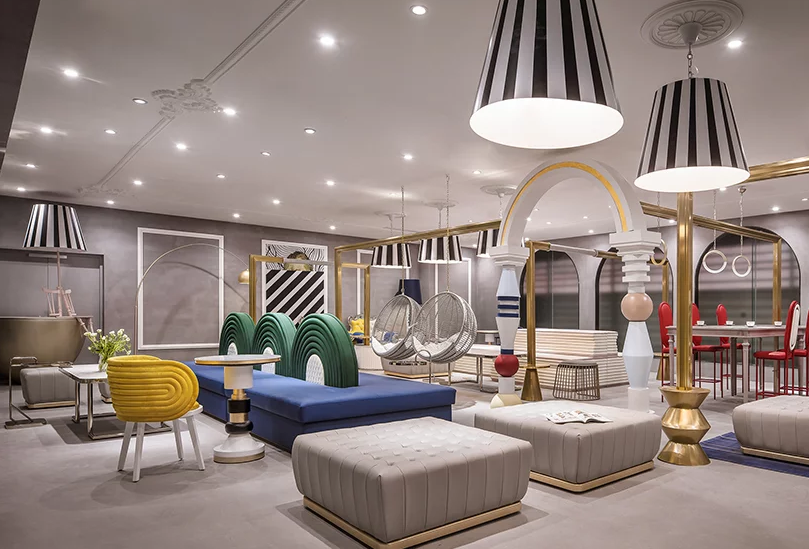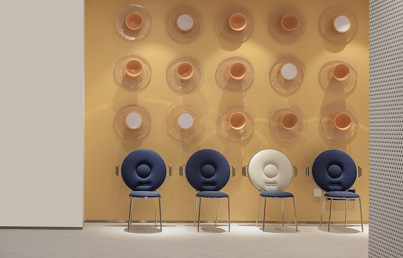 二樓,2樓,作為用餐空間。重點(diǎn)放在走廊末端區(qū)域的設(shè)計上,使用彩色背景墻以及與餐廳相關(guān)的有趣家具和裝置。