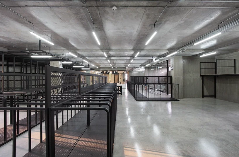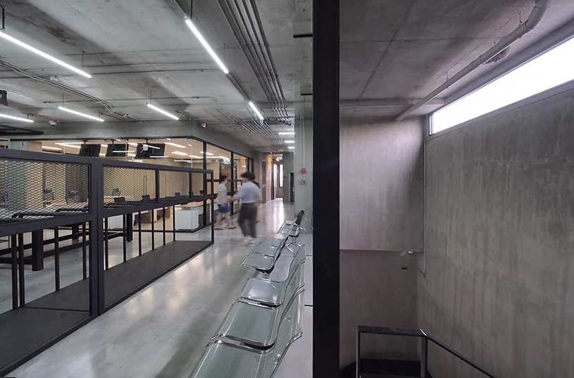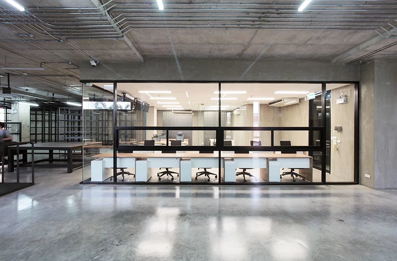 二樓辦公室裝修中充當(dāng)皮革展示區(qū)和辦公空間。每層的窗戶隔片都是可以旋轉(zhuǎn)的,而且窗戶是凹進去的,這樣帶來的是間接的光線,不會損傷皮革制品。辦公區(qū)和展示區(qū)都是很寬大的,整體有著很濃的工業(yè)風(fēng)格。