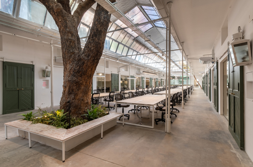 辦公室裝修采用了綠色和白色,和大樹相匹配,顯得更自然。