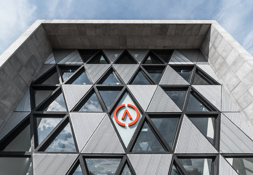 為了與綠樹成蔭的溪流建立聯(lián)系,從公司的大堂就營造了視覺效果。同時,延伸到建筑外部的外部露臺。外主立面設(shè)計為三角形圖案,以公司的企業(yè)形象為參照,具有象征性和獨特性,圖案的基本模塊對應(yīng)于組織標(biāo)識的同型,該標(biāo)識包含在立面的中心部分。
