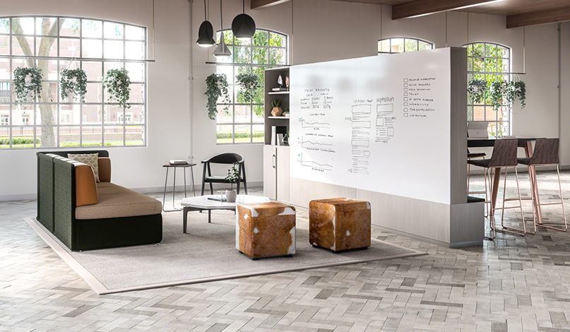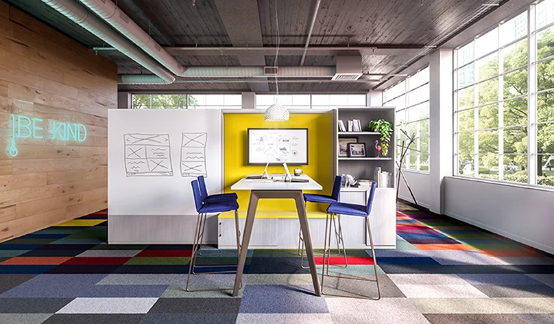 由于Steelcase尋求在開放空間和個人辦公室之間找到一個折衷方案,所以在他們在辦公室裝修中除了工作站之外,該公司還提出了協(xié)作要素。為了支持團隊合作和工作場所內的共享,這些元素允許為演示和會議以及接觸設置一個開放的布局空間。