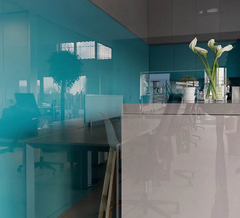 辦公室裝修設(shè)計中部分采用了光滑又帶有反射的材料。