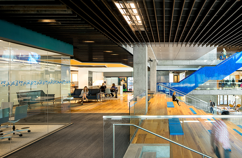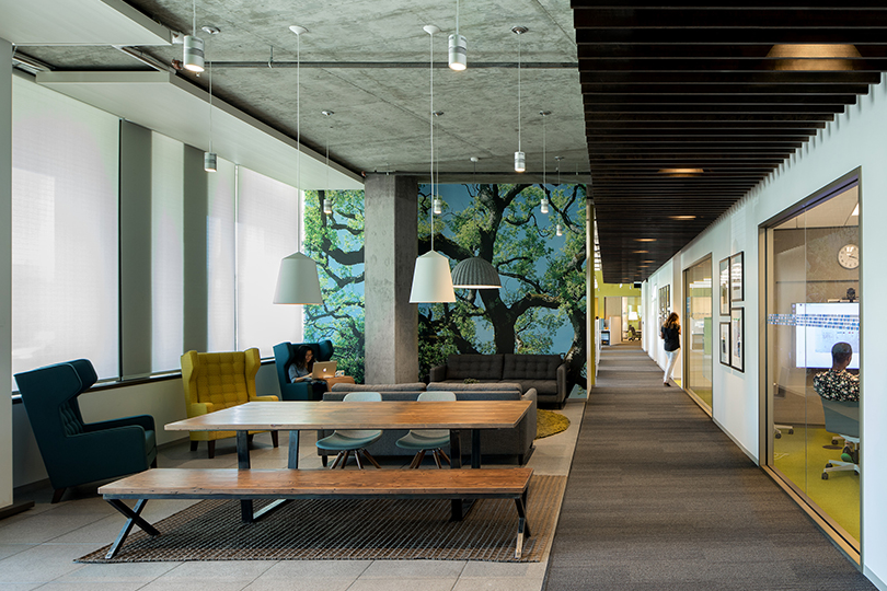 四層的辦公室裝修。在主中庭空間從校園的東、西兩側(cè)吸引活動,并作為MWB和大Intuit社區(qū)的中心。沿著中庭的每一個樓梯平臺和露天看臺直接連接到一個大的“起居室”,可以用餐也可以工作。辦公室裝修中除了陽臺和休閑軟家具設(shè)置等更為私密的突破空間,這些空間提供了一系列工作機會,沿著中庭周邊的各種程序功能有助于在整個工作日產(chǎn)生一致的活動。
