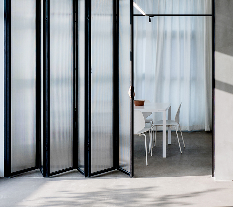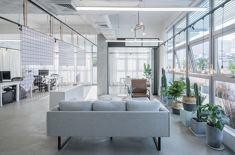 沿側(cè)壁的辦公室裝修中采用白色漆金屬架可用于儲存、展示模型以及放置花盆。在地面以上2.5米處,幾組黑色涂漆金屬框架相互連接形成“回路”,可用于懸掛釘板、安裝懸垂軌道和軌道照明。