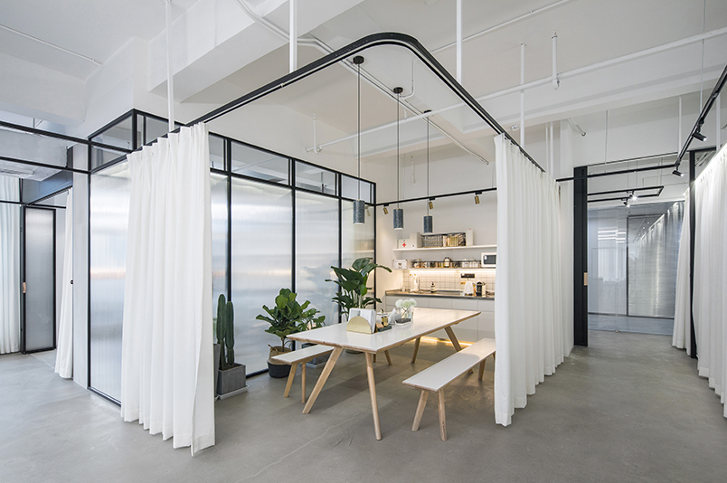 這家辦公室在深圳,一個透明的單色開放空間,辦公室裝修設(shè)計上采用了一些工業(yè)設(shè)計。辦公室裝修的現(xiàn)代建筑的規(guī)律與空間中用作隔斷和陰影的白色亞麻布窗簾的柔軟和微妙形成對比。下面就跟著華發(fā)小編一起來看看這個辦公室裝修效果圖吧。