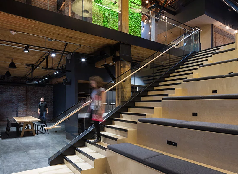 從結(jié)構(gòu)和建筑規(guī)范的角度來(lái)看,需要實(shí)施多種創(chuàng)新的替代解決方案,以便在三層樓的幾個(gè)獨(dú)立防火室中創(chuàng)造連續(xù)流動(dòng)的空間。在這個(gè)辦公室裝修項(xiàng)目中,萊基工作室尋求整合現(xiàn)有的裸露結(jié)構(gòu)磚,重型木材梁和機(jī)械基礎(chǔ)設(shè)施與當(dāng)代細(xì)節(jié)和日常的實(shí)用材料。