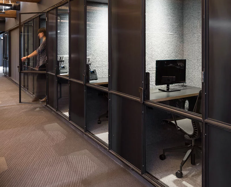 辦公室裝修中為了避免產(chǎn)品和部件的長(zhǎng)時(shí)間周轉(zhuǎn),團(tuán)隊(duì)最終利用現(xiàn)有的貿(mào)易關(guān)系來(lái)加快定制安裝-最明顯的是內(nèi)部玻璃隔板和門(mén)組件。這些元件是由工業(yè)熱軋鋼部件制成的,這些零件還用于定制家具,如前臺(tái)和廚房貨架。