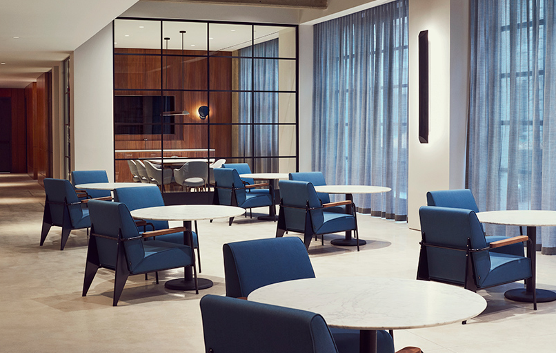 在辦公室裝修第五層是音響良好的私人辦公室,可容納1至6人,以及會議室、開放式辦公桌和充滿定制家具和裝飾藝術(shù)的休息室。辦公室裝修一間設(shè)備齊全的預(yù)備廚房里堆滿了大理石臺面、拋光的混凝土地板、伯托亞邊椅和橢圓形的eero Saarinen設(shè)計(jì)的餐桌-這不是典型的陳腐的辦公用品。