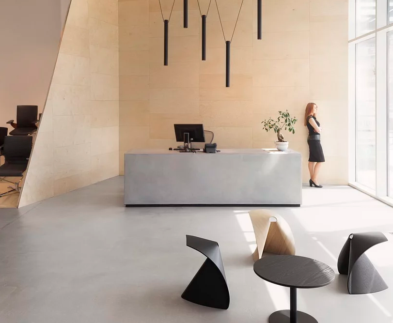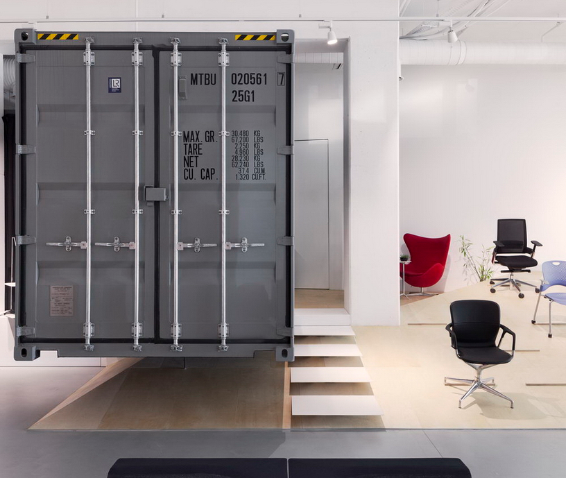 辦公室裝修傾斜的膠合板平臺允許椅子的高度安排,并通過這種方式暴露在每一個觀賞點。這個木制元素垂直向上,動態(tài)地圍繞著接待區(qū),“引導”顧客從展廳的入口到經理區(qū)。在集裝箱和膠合板平臺外,整個辦公室裝修空間的設計盡量減少使用材料-混凝土地板、白色墻壁、天花板和設施。這一設計,結合航運集裝箱,辦公室裝修創(chuàng)造了一個簡單的工業(yè)外觀,強調復雜的模式和精確的細節(jié)所展示的家具。