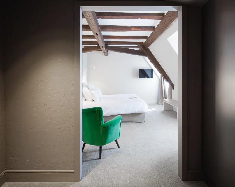 通過(guò)單色“鎖”(夜藍(lán)色或灰褐色)進(jìn)入房間,可通往浴室,衛(wèi)生間和房間。這個(gè)空間還包括一個(gè)相同顏色的櫥柜,包括衣柜和帶迷你吧和咖啡機(jī)的服務(wù)柱。保留了木梁和鑲板。桌子和軟墊長(zhǎng)凳完成了布局。