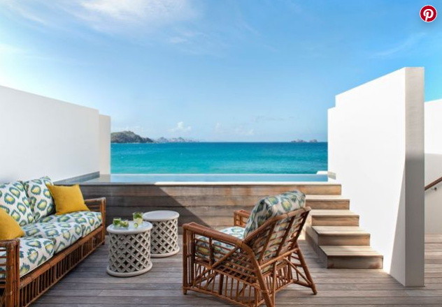 客房休閑區(qū)面向大西洋,連接露臺和睡眠區(qū)。由馬賽克藝術(shù)家Delphine Messmer,柳條扶手椅(Serena&Lily)的咖啡桌。在地面上,編織棕櫚墊(Beauvais Carpets)