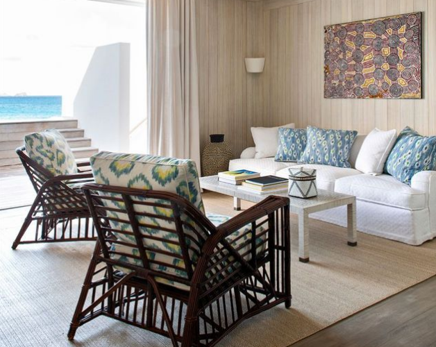 建筑師Kirscher設(shè)計的新海灘套房提供帶私人游泳池的田園風(fēng)格露臺。沙發(fā)和藤椅(serena&Lily)覆蓋著ikat面料(IDO擴(kuò)散)。靠墊(設(shè)計師協(xié)會)。