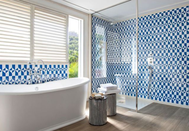 浴室朝向花園,其晨光透露出所有的輝煌。藍(lán)色和白色摩洛哥zelliges(別墅巴黎)圖表比賽。陶瓷凳子(Asiatides),浴缸(Devon&Devon),水龍頭(Lefroy Brooks)。